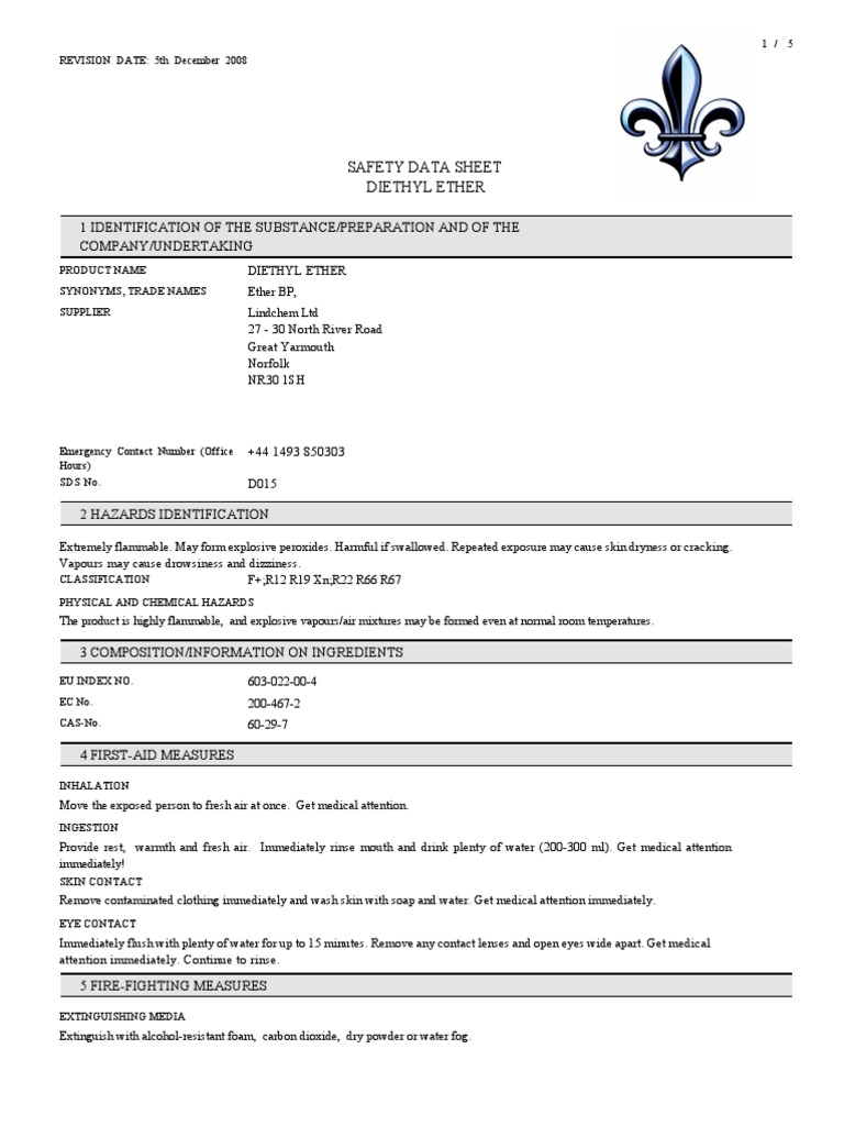 1200 mg m3 twa personal protective equipment eyes. Diethyl ether page 2 of 6 this fact sheet is a summary source of information of all potential and most severe health hazards that may result from exposure. Safety data sheet version 5 2 revision date 02 24 2014 print date 02 25 2014 1. Diethyl ether is also extremely flammable.